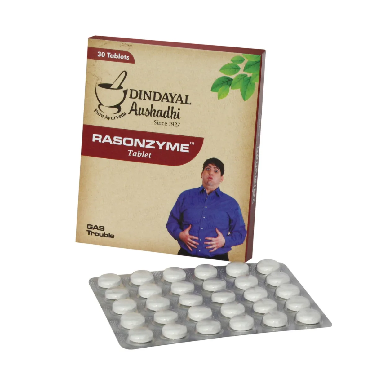 Rasonzyme Tablet is a powerful herbal formula that supports healthy digestion and boosts appetite. It works fast to relieve acidity, gas, and discomfort, making you feel lighter and more comfortable. Rasonzyme controls common digestive issues like belching, bloating, and flatulence, while also easing symptoms of indigestion and dyspepsia. It gently helps with chronic constipation, promoting smooth and regular bowel movements.