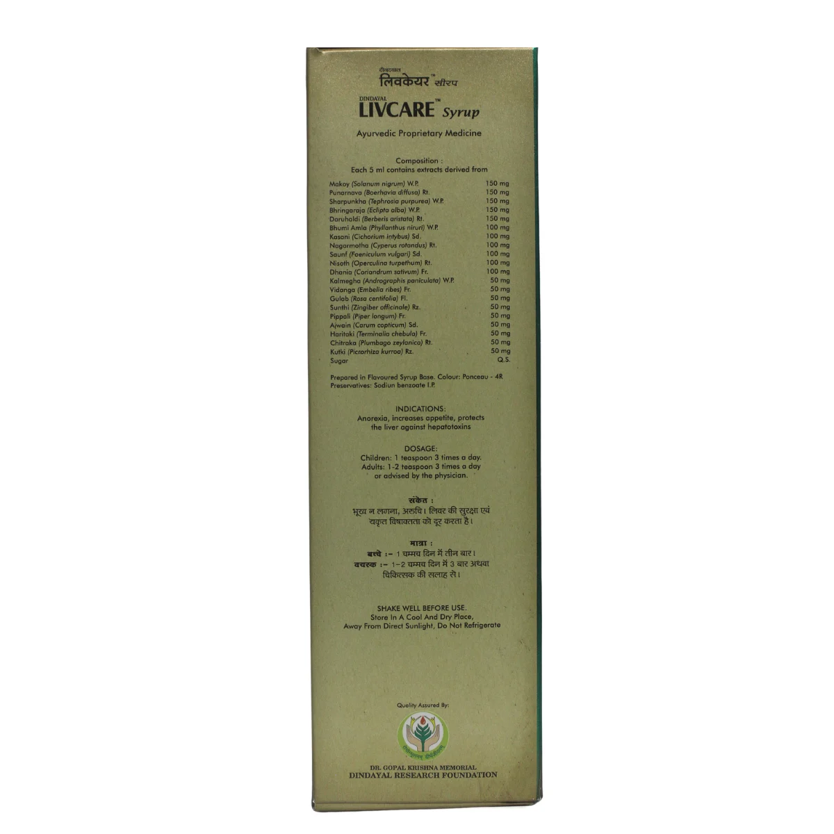 Dindayal Livcare Syrup is a potent herbal formulation designed to support liver health and address a wide range of liver conditions. Enriched with powerful herbs and roots known for their benefits to the liver and gastrointestinal tract, it helps optimize liver function and promotes natural detoxification. The syrup is safe, free from side effects, and works effectively to stimulate appetite, improve overall health, and provide therapeutic support for conditions like Indian childhood cirrhosis and malnutrition.