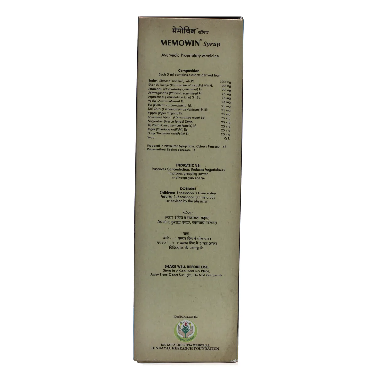 Dindayal Memowin Syrup is a specially formulated herbal brain tonic ideal for growing children and students. It supports cognitive development by enhancing memory, concentration, and learning abilities. The syrup helps restore healthy sleep patterns, improves overall mental function, and promotes emotional well-being. With regular use, it helps children feel more confident, focused, and enthusiastic in their daily activities and studies.